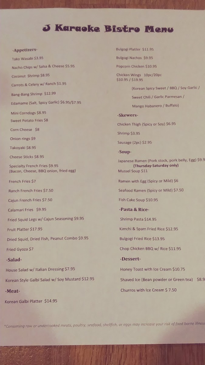 We had a big group of 10 that was promptly accommodated ! This karaoke spot has been around for at least a decade and is always a fun time! The interior is looking a bit older and dated but it does the job. Service and food were super quick and everything tasted pretty good. Our group would recommend the nachos( both bulgogi and chicken) and coconut shrimp!