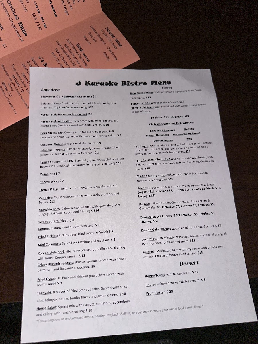 We went to J karaoke for a party with some friends. We had a very large party 30 people, which I know can be hard to accommodate, but the staff did an amazing job. There is a full service bar with a great liqor selection right when you walk in the door. The karaoke rooms are private, and have youtube access to an endless amount of songs. I wasn't expecting the bar to have food, but they did. My friends ordered just about everything on the menu, and everything I tried was really good. The bar was lots of fun, and we had a great time.